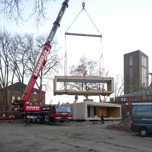 Sechs Jahre stand das openOffice an seinem alten Standort auf der Zeche Zollverein. Das Gebäude ist so konzipiert, dass es in seinem Standort verlagert werden kann. Am 29.11.2016 hat es diesen Test bestanden. Wir haben es auf das Areal des TÜV Nord Bildung - in 200m Luftlinie - verlagert, wo es zukünftig als Schulraum für die Weiterbildungsangebote des TÜV genutzt werden wird.